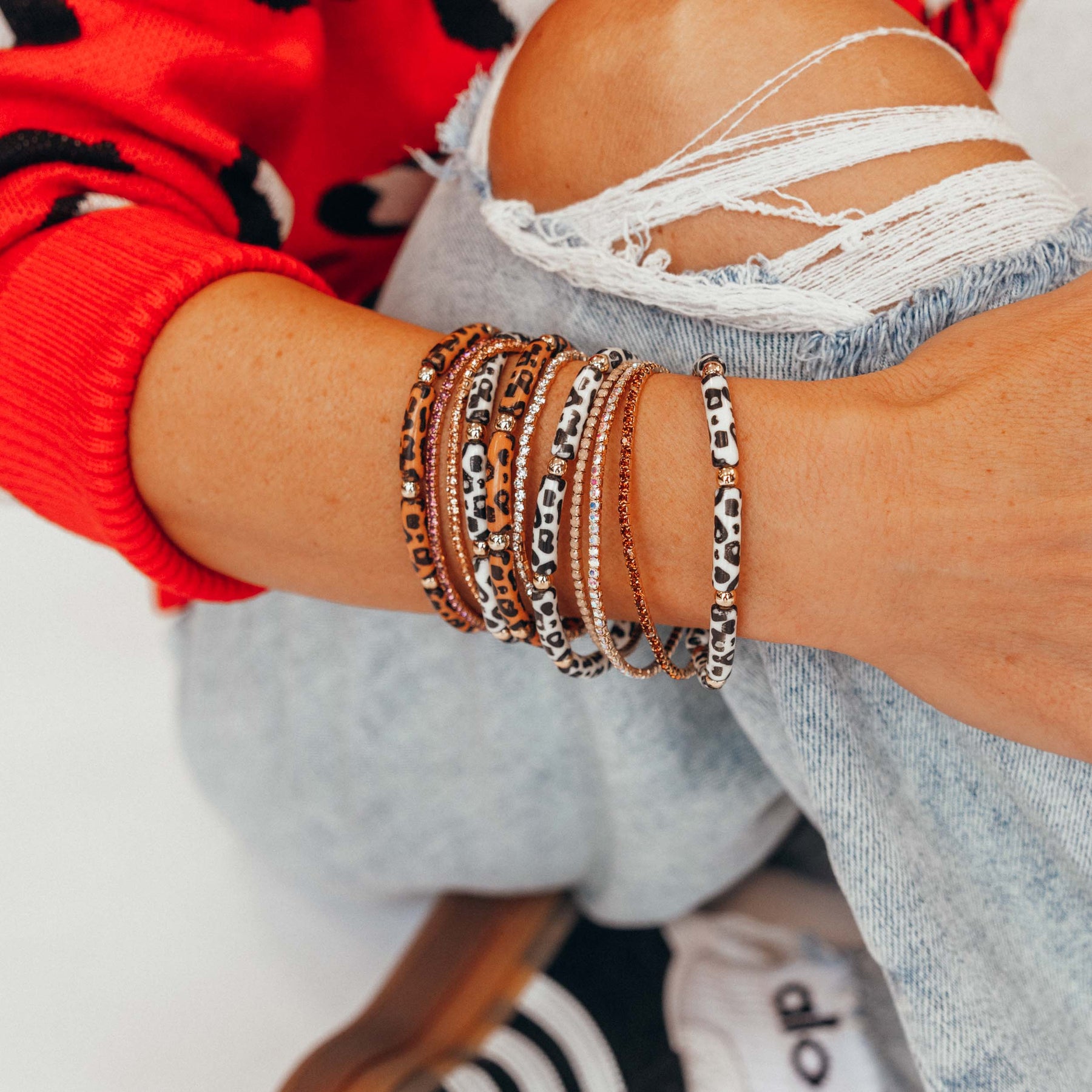 • The Animal Starter Stack features unique leopard print acrylic bracelets that are both lightweight and stylish. This playful set adds a bold, trendy touch to your look while keeping comfort front and center.