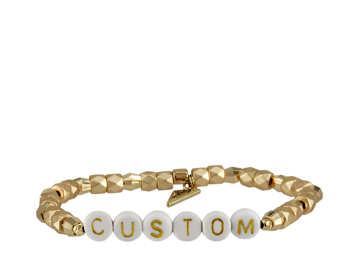 - Our custom name bracelet O is a long-lasting reminder that says everything you need to. Share with a loved one or wear as an everyday intention. Choose between gold, silver or black beads.