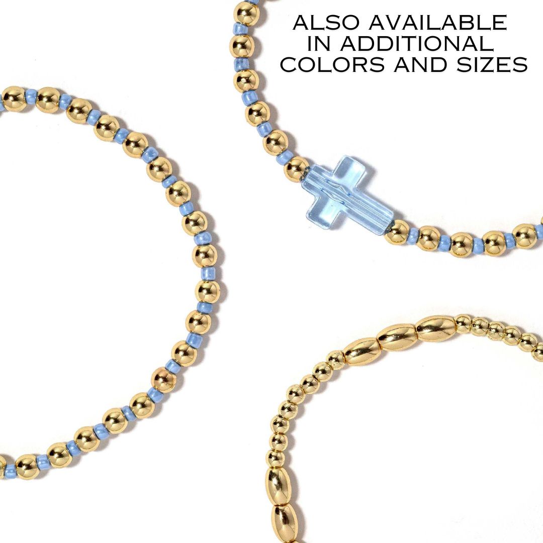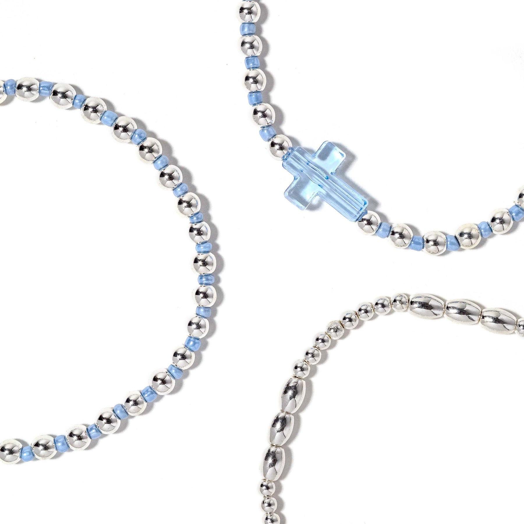 - Add a touch of elegance to your wardrobe with our Cross starter stack. Adorned with pastel blue cross with blue and gold or silver beads, this accessory is a delicate representation of the holiday season. Embrace the sophistication and exclusivity of this bracelet, perfect for any springtime event.