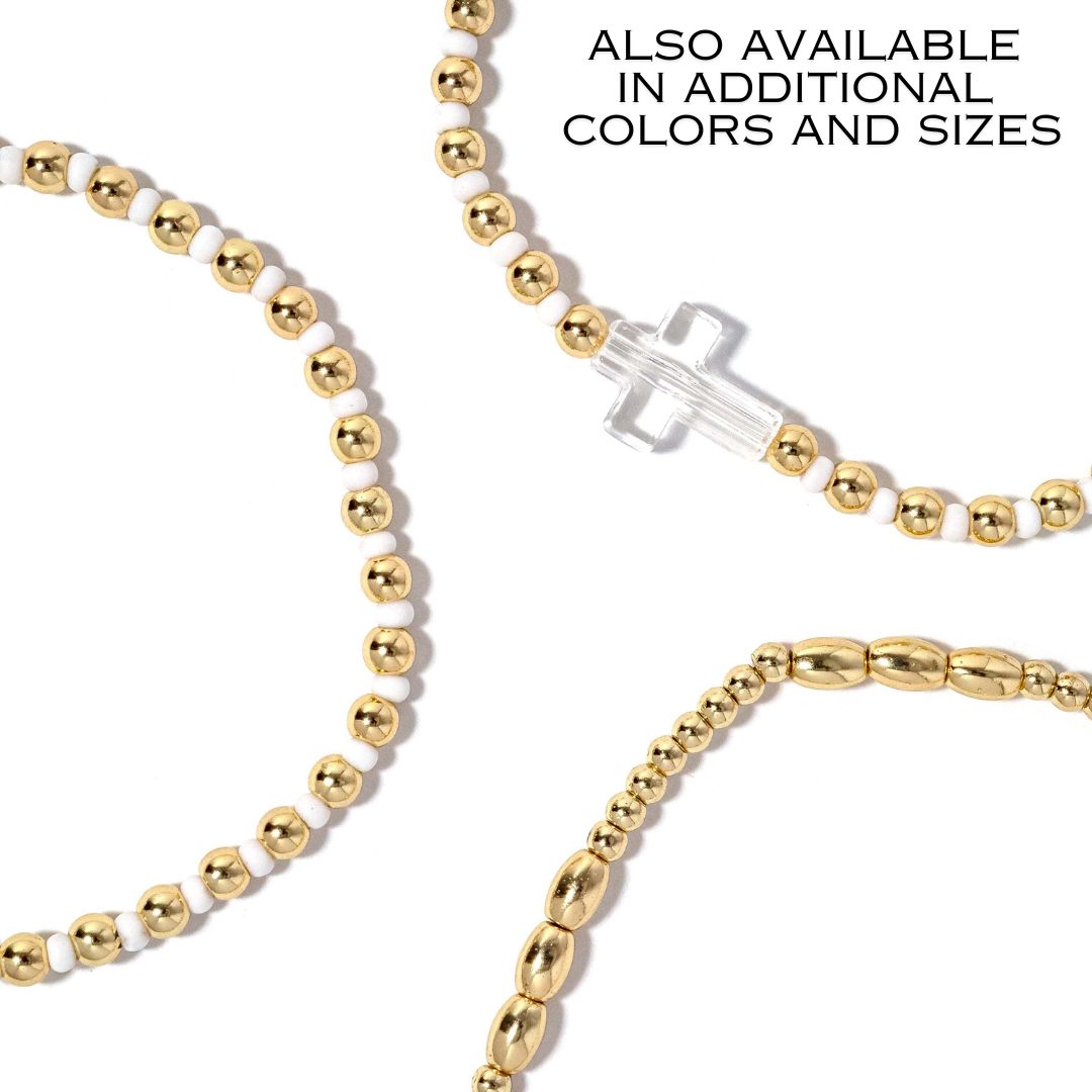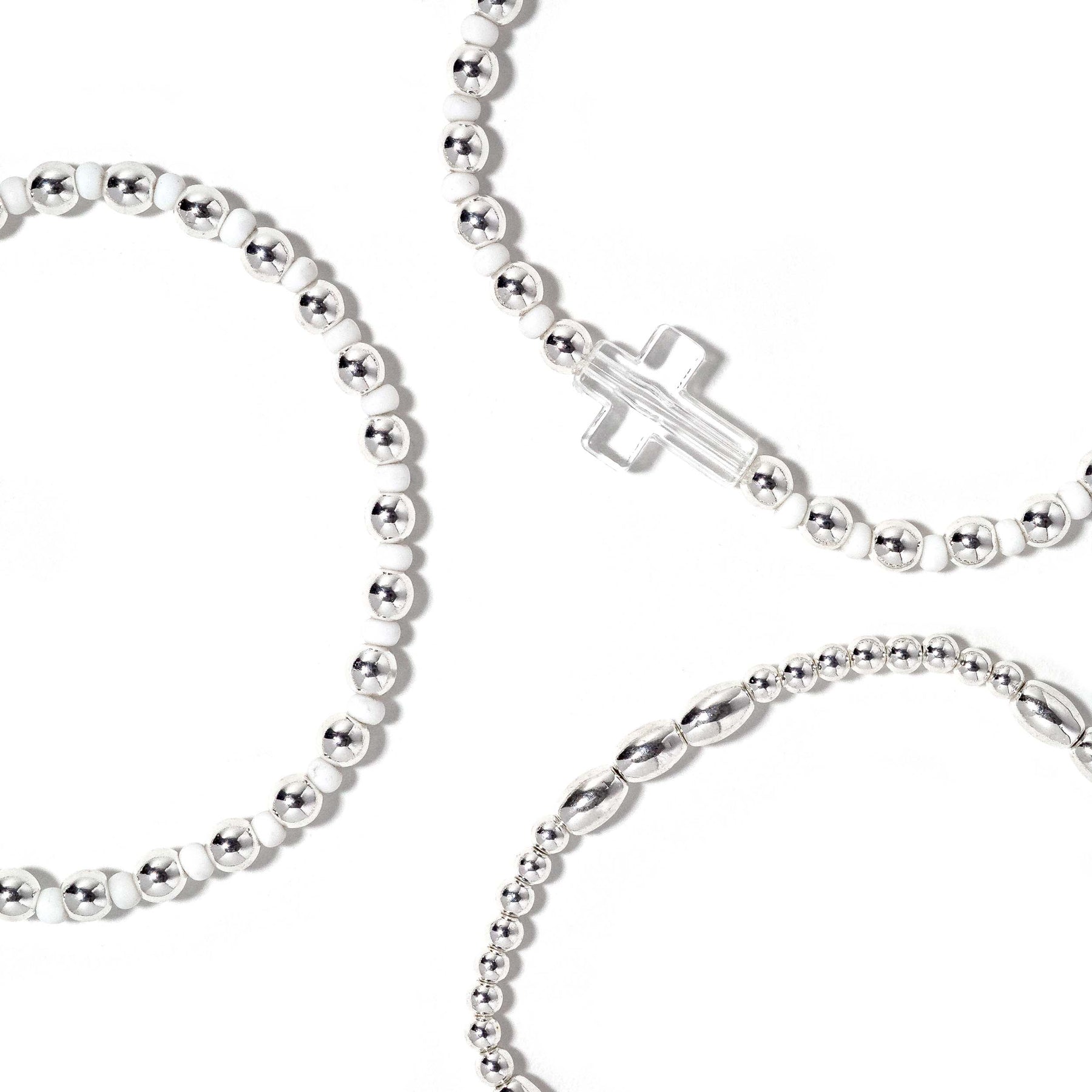• Add a touch of elegance to your wardrobe with our Cross starter stack. Adorned with clear crystal cross with white and gold or silver beads, this accessory is a delicate representation of the holiday season. Embrace the sophistication and exclusivity of this bracelet, perfect for any springtime event.