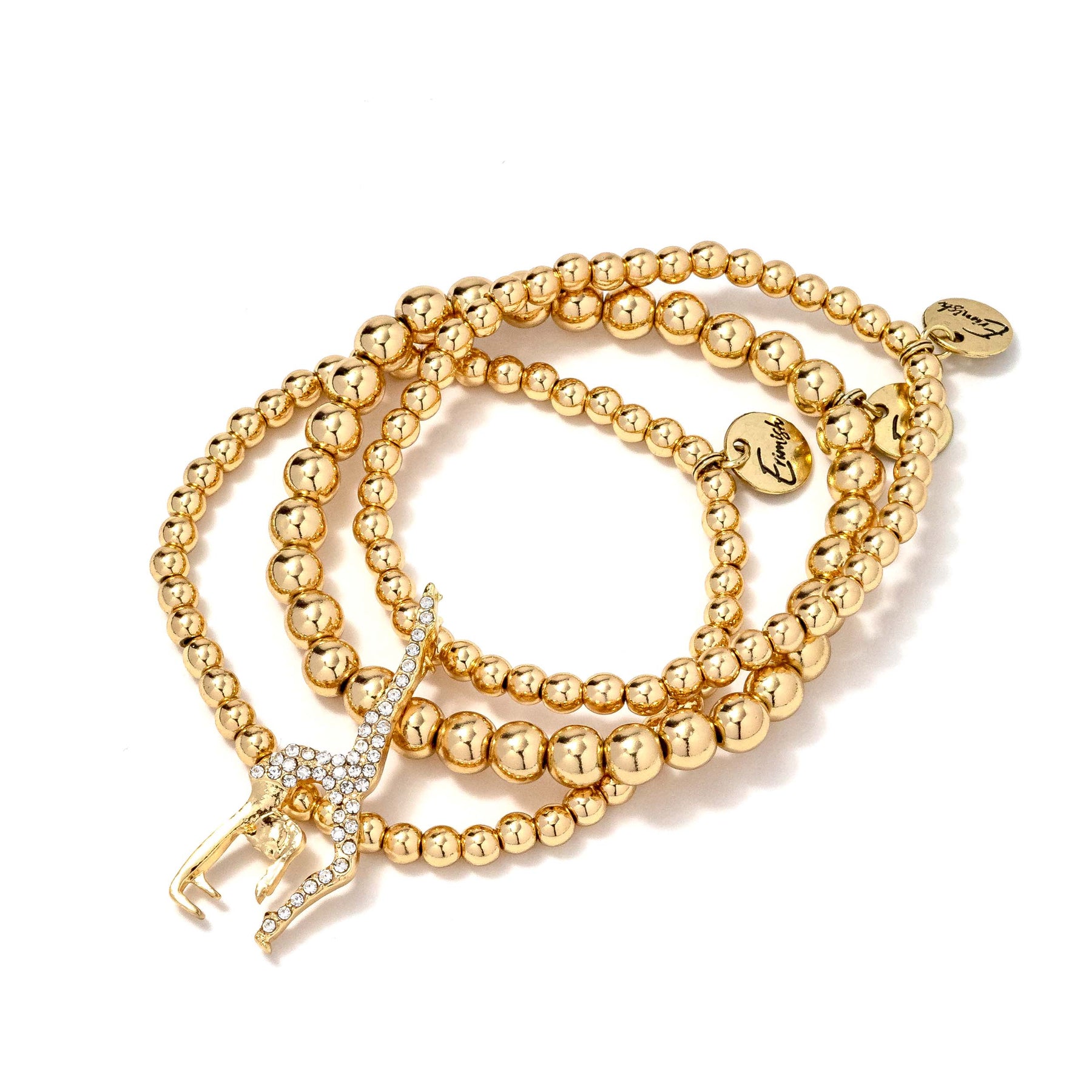 • Get ready to shine in the stands with our Sporty Gymnastics Starter Stack! This unique set includes three sleek gold bracelets and a darling gymnast charm that will catch everyone's eye. Make a statement and show off your sporty style with this must-have accessory.