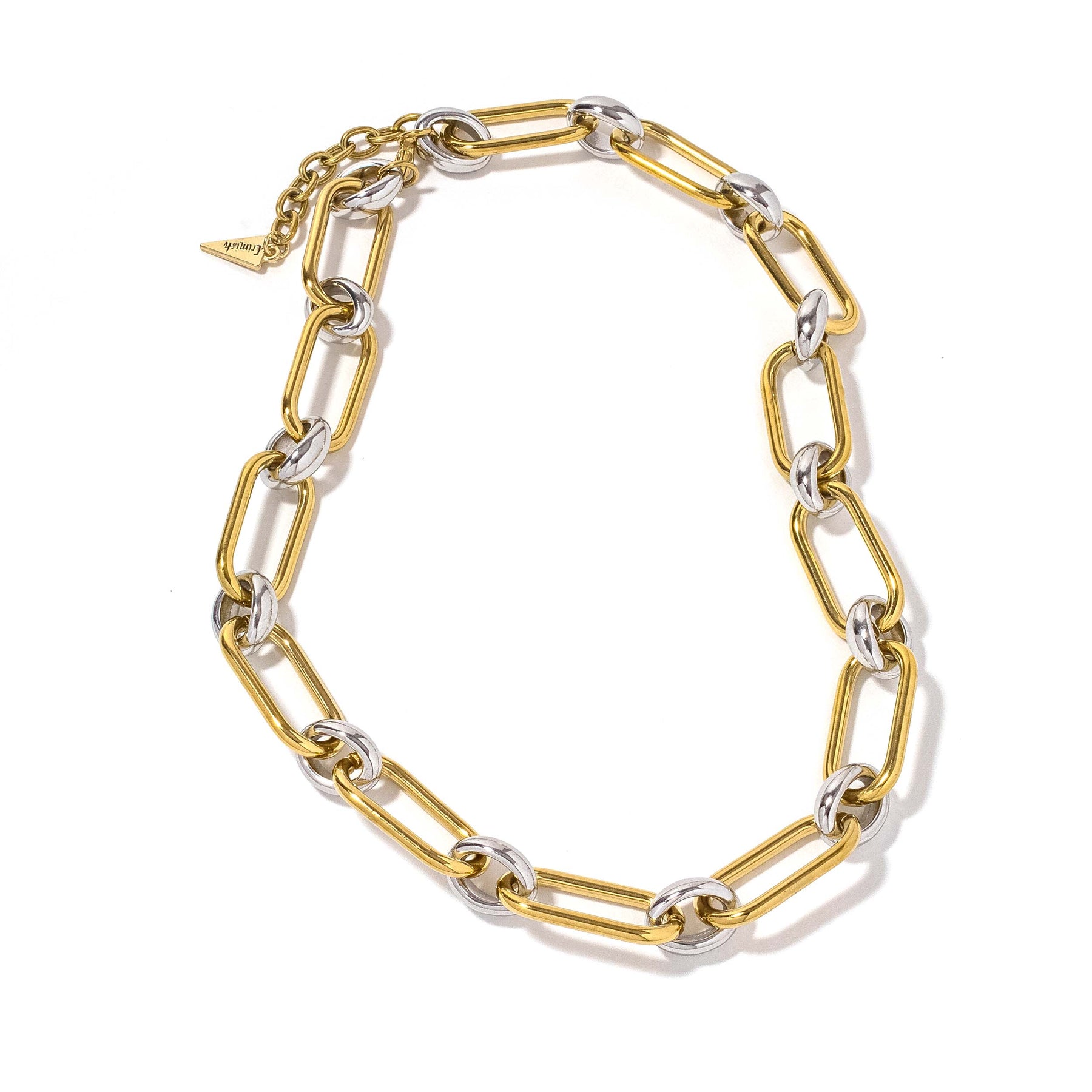 This necklace features a a sophisticated chain link design crafted from mixed metals. This elegant piece effortlessly blends classic style with modern refinement, making it an ideal choice for both everyday wear and special occasions. Its versatile design adds a subtle yet striking touch to any ensemble.