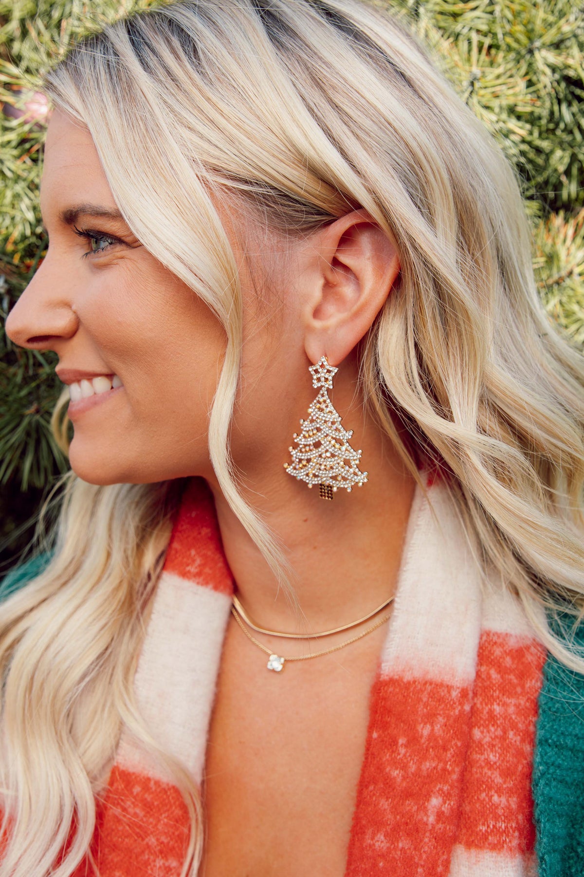 The perfect addition to your festive outfit, the Bling Tree Earring will add some holiday spirit to any occasion. With its sparkling pave design and fun Christmas tree shape, this earring is sure to make a statement.