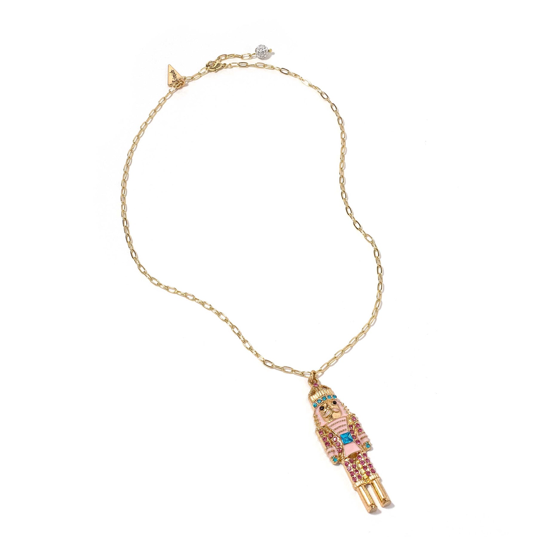 Add a touch of whimsy to your outfit with our Nutcracker Necklace. The colorful pave stones add a pop of color while the nutcracker pendant brings a playful twist. Perfect for anyone who loves unique and fun accessories!