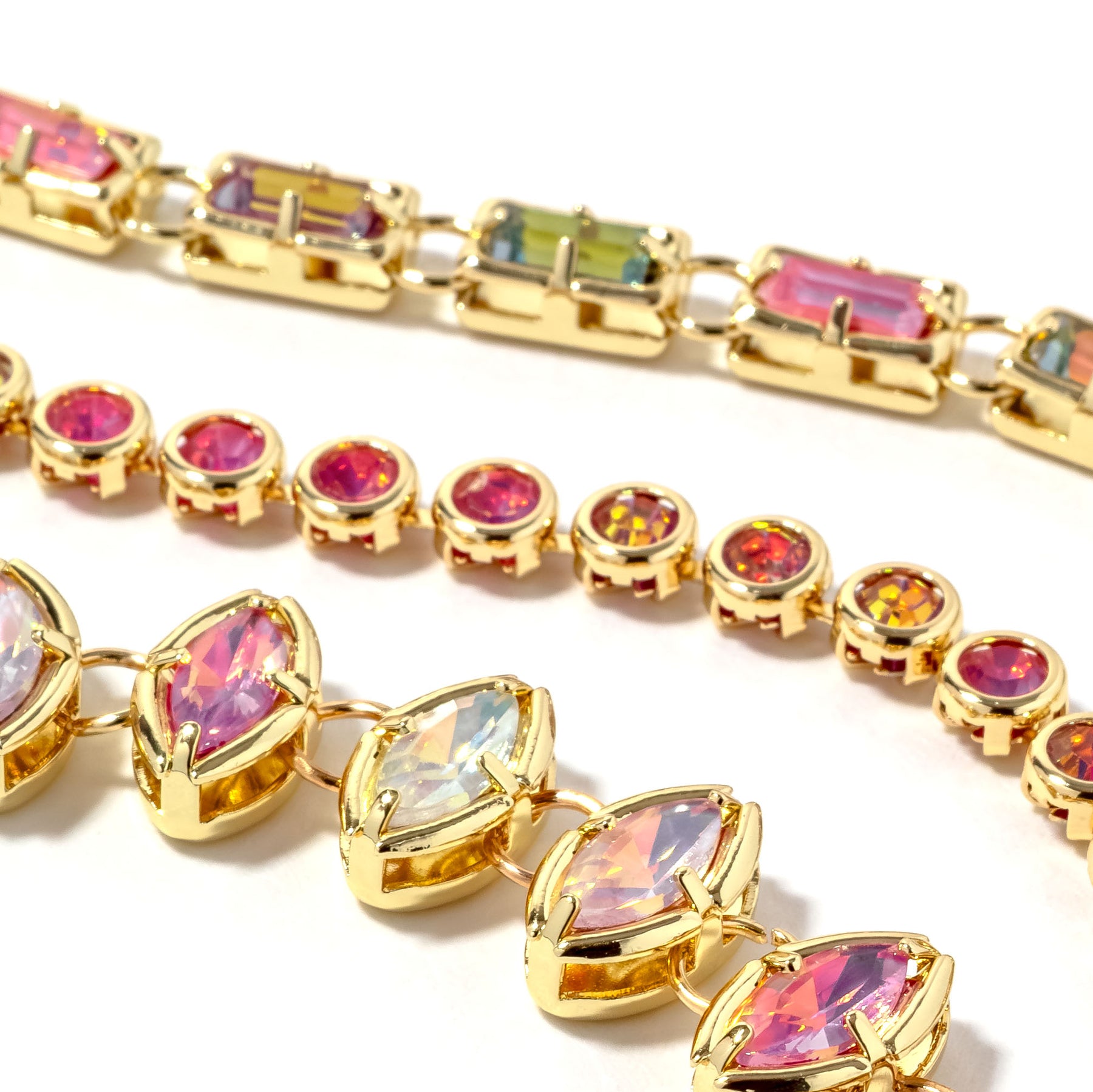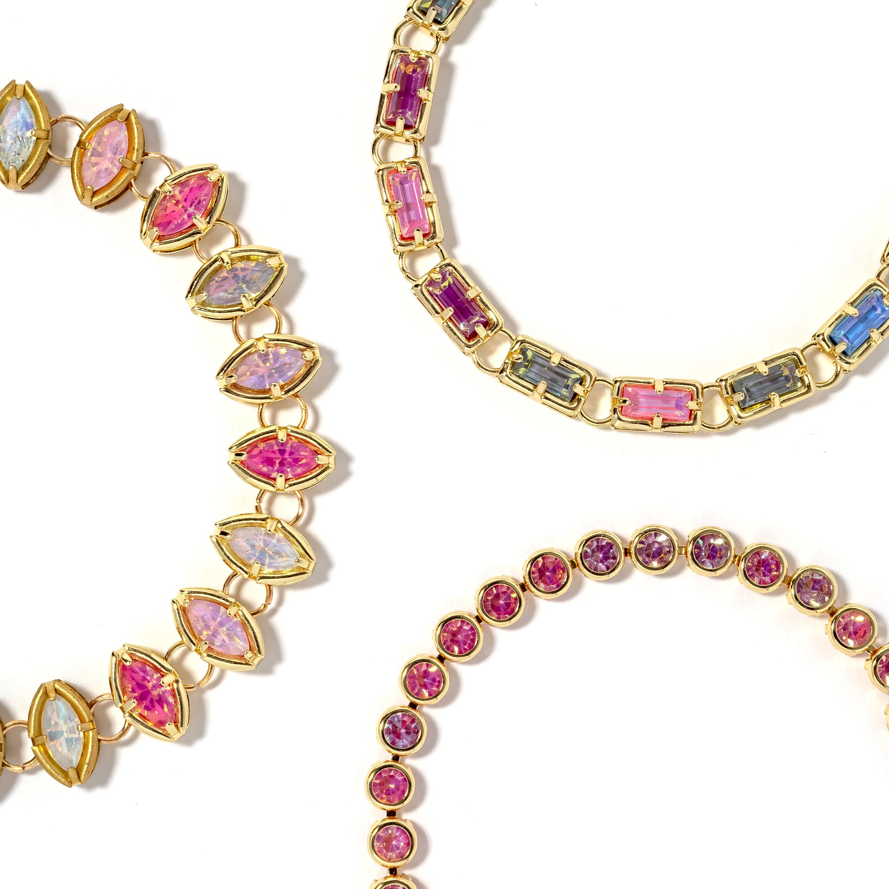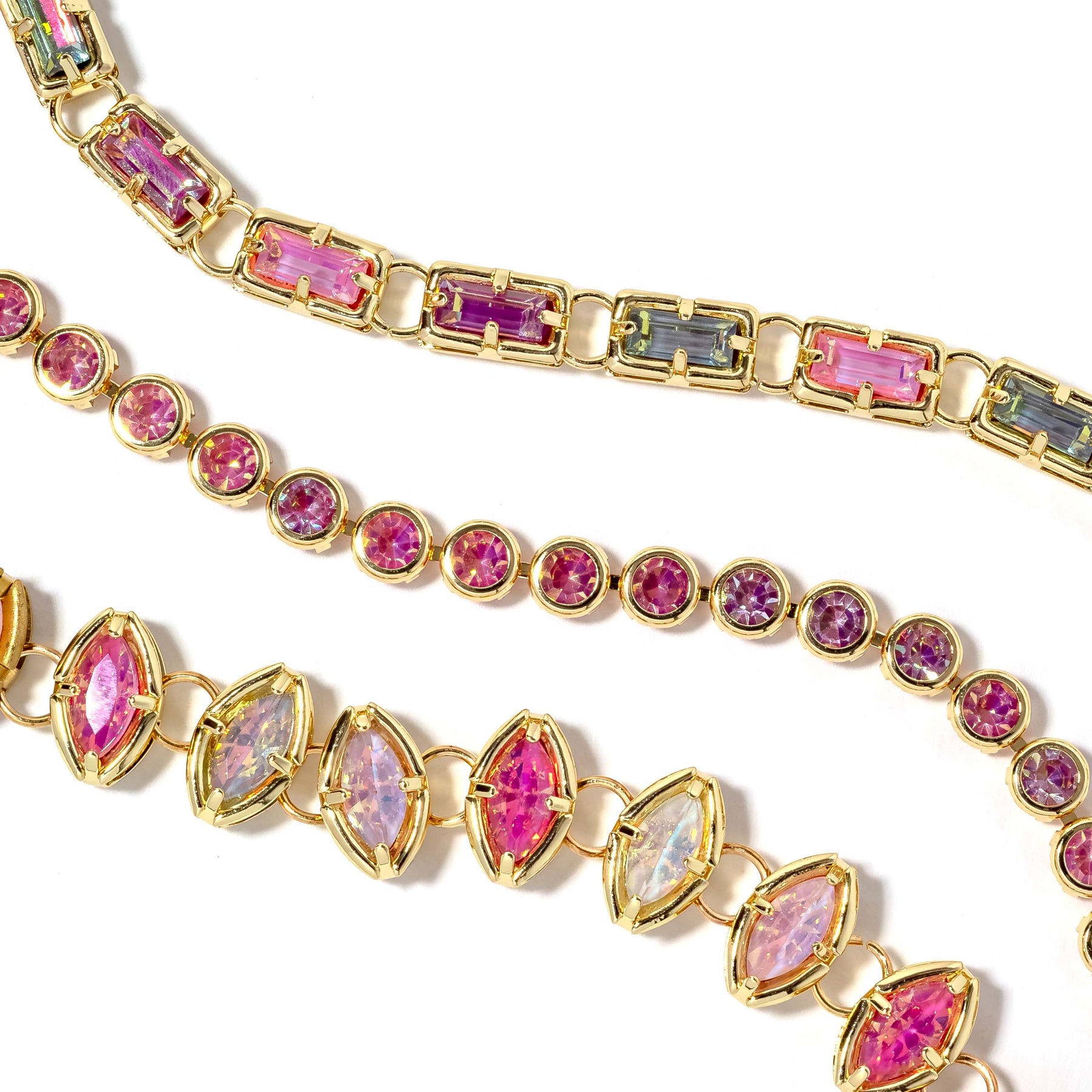 Layer elegance with the Hollis Stack, a refined three-piece bracelet collection in soft pink tones. Each piece features radiant crystal stones set in gold plating, designed to wear together or separately for versatile styling. The interplay of light across the faceted stones creates a luminous effect that elevates any look with understated luxury.