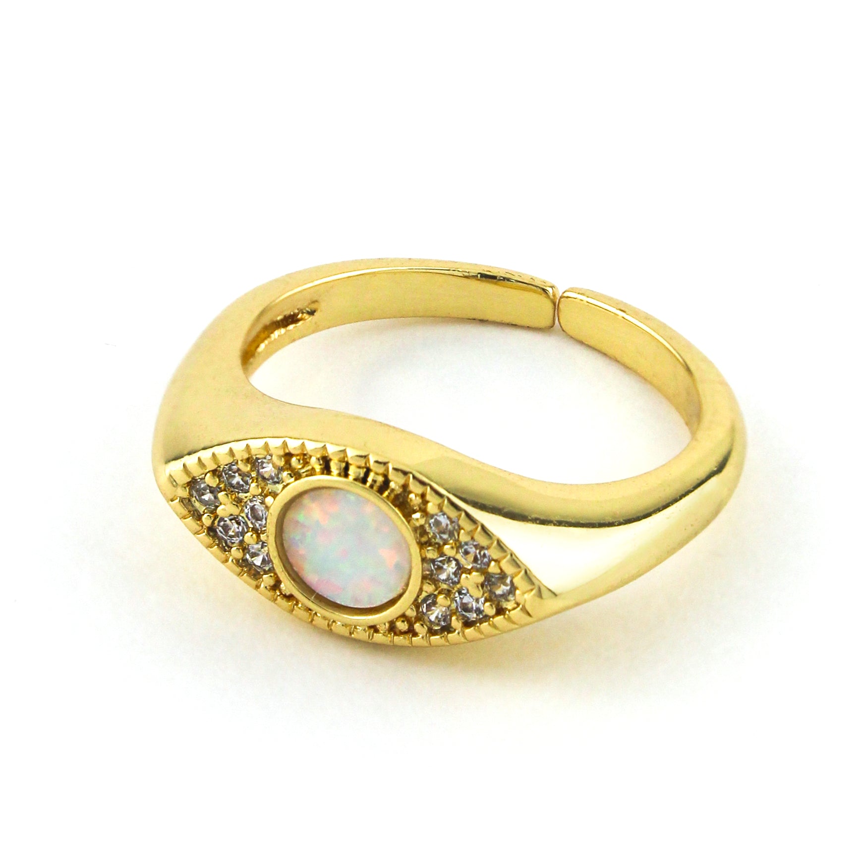 - Experience timeless elegance with the Third Eye Pink. Featuring an adjustable band and sparkling zircon stones in an evil eye gold setting, this ring adds a touch of sparkle to any outfit. Feel confident and stylish with this classic yet stylish piece.